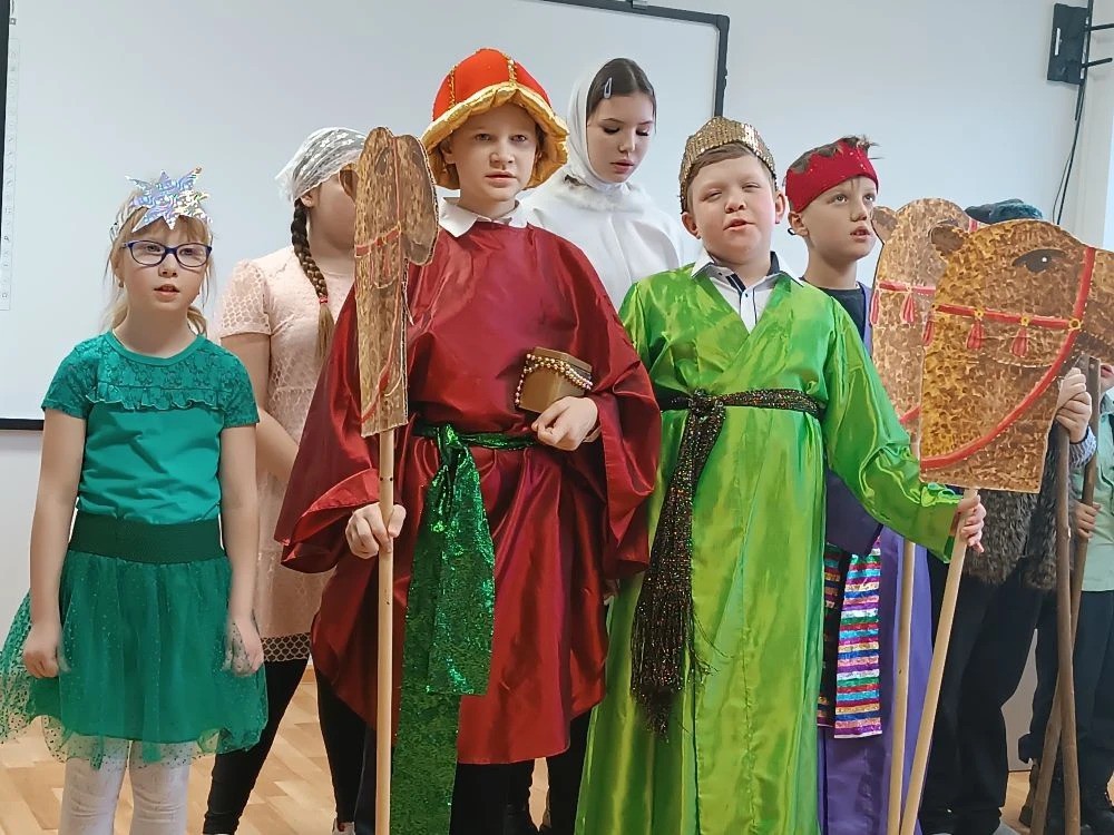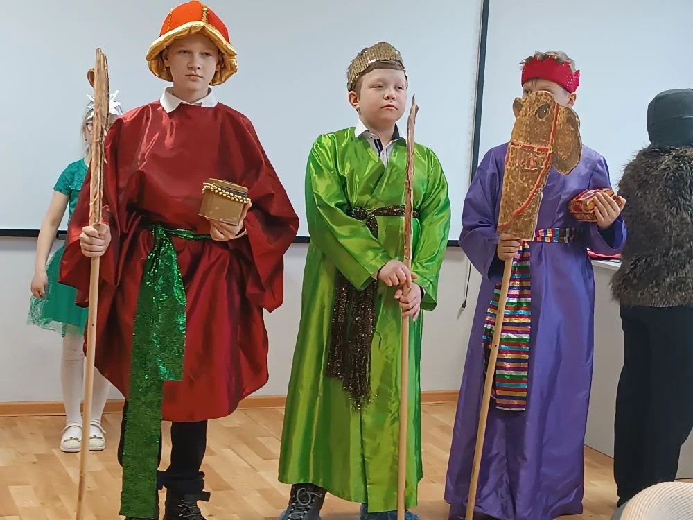 Воспитанники воскресной школы ещё раз вспомнили и пережили момент Рождения Господа нашего Иисуса Христа, а юные зрители внимательно слушали и смотрели, как перед ними появляется Вифлеемская звезда, скромные пастухи, волхвы в ярких одеждах верхом на верблюдах, белокрылый ангел, и как спорили между собой деревья: стройная пальма, прекрасная пахучая маслина и скромная зелёная ёлка.